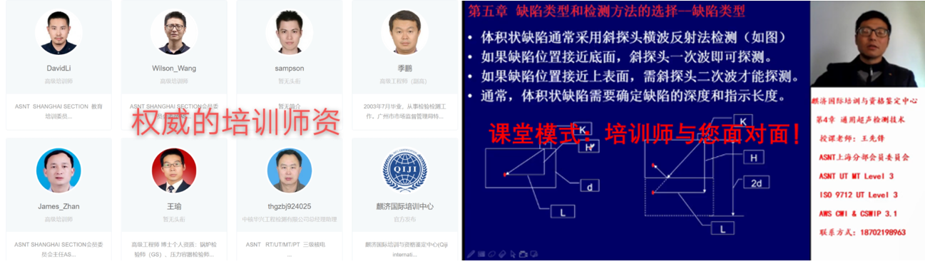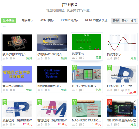涵盖了ISO9712 各方法课程模块、ASNT美标各方法课程模块、API检验师(510、570、653...)课程模块、焊接/焊接检验/CWI/CSWIP课程模块,各模块下分设不同的课程章节、练习题、在线答疑等,使得在线课程具有不低于线下培训课程的知识输入量。每一课程模块均由行业权威培训师、专家讲解,学员可以在听课期间及后期持续与我们的老师进行在线沟通,我们的培训师愿意担任每一位参训学员的终身技术顾问。