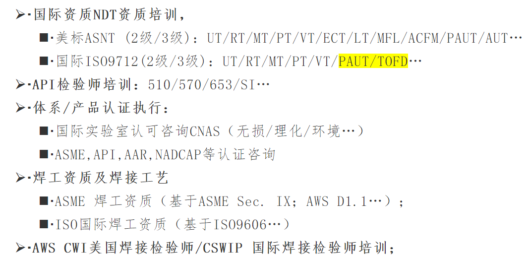 中心培训咨询技术力量雄厚,国际资质俱全。咨询师团队具有丰富的国际质量认证咨询经验且持有ASME、API等多种国际资质(NAS410、ASNT、AWS CWI、IWE、CSWIP、ENISO9712、NACE、SSPC、API…),中心可实现全英文授课。
