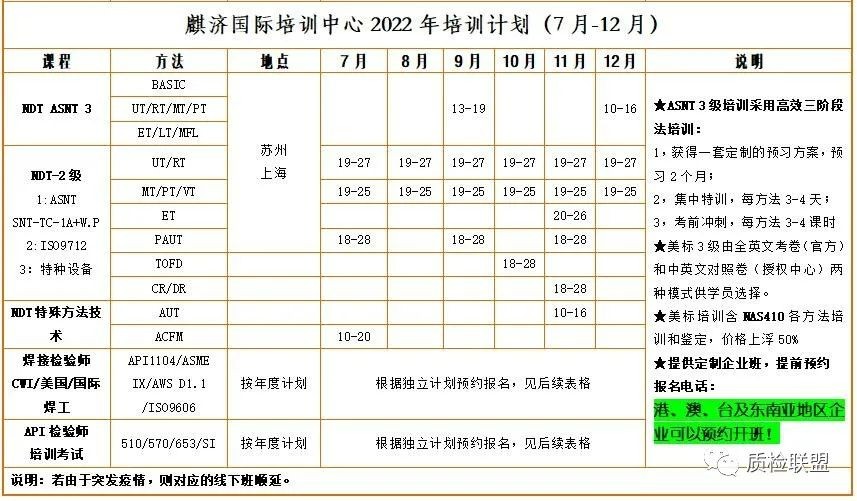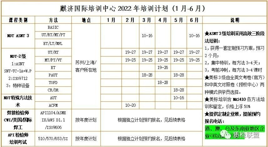 麒济国际培训与资格鉴定中心是专业从事重工质检领域国际资质/资格培训认证的国际性机构,是美国无 损检测学会企业合作伙伴(ASNT CORPORATE PARTNER,合作伙伴编号No.290680),是包括欧美标准NDT人员资质、美国石油学会API检验师资质、美标国际焊工资质等在内的国际质检培训机构。目前在中国大陆设立上海中心,在中国台湾设立台湾中心,在美国纽约设立纽约中心。2022年继续举办质检领域各检测、检验师国际资质培训及考试,涉及: